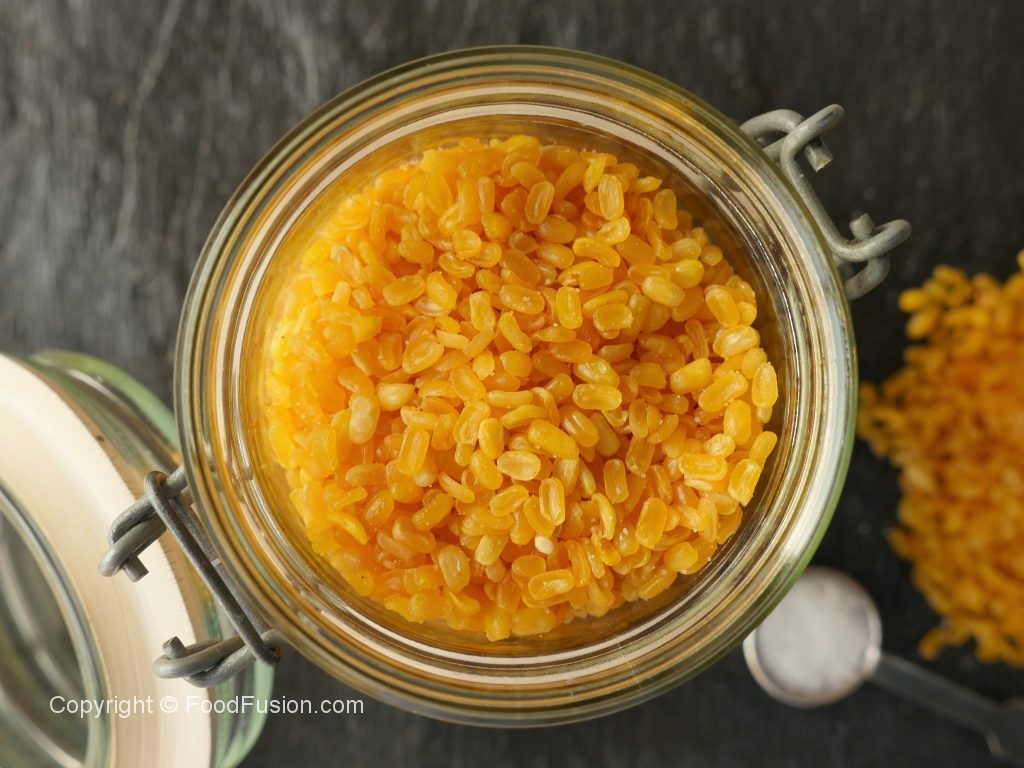 Soak yellow lentil gram in water for 3-4 hours then strain,spread out evenly on a tray so that all the water is removed and pat dry completely.