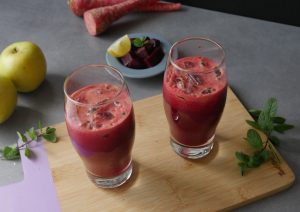 Juicer machine mein saib,chukandar,gajar aur adrak dal ker juice nikal lein.