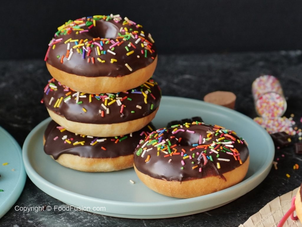 Doughnuts rakh dein,non-stick spray karein aur 150C per 4-5 minutes kliya bake ker lein.