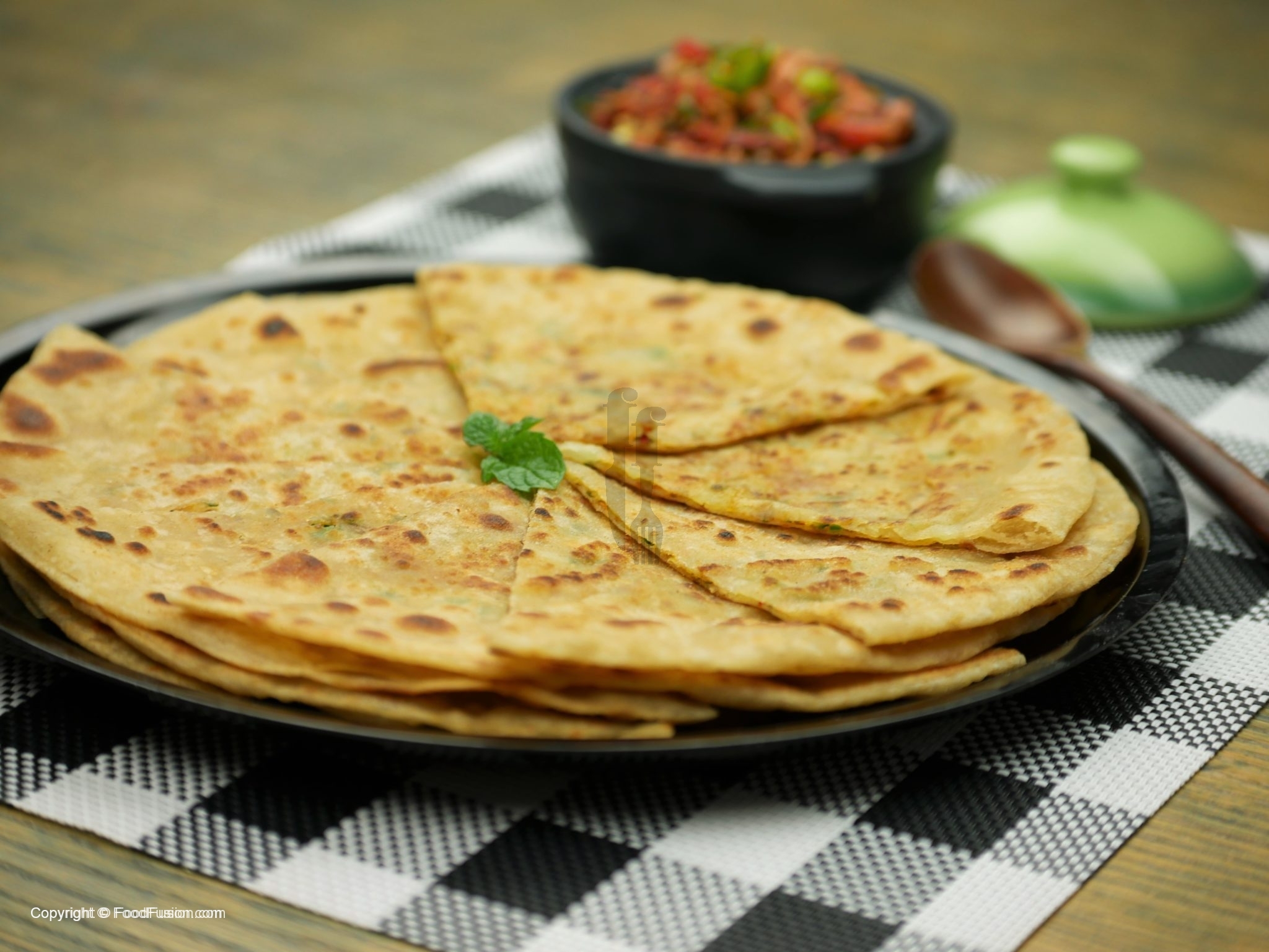 Heat griddle and place rolled paratha on it, fry from both sides with ghee.