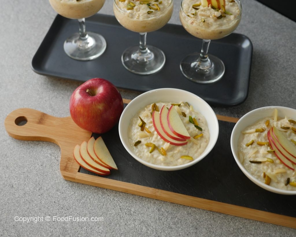 In serving dish,add apple kheer and garnish with apple slices,pistachios and almonds.