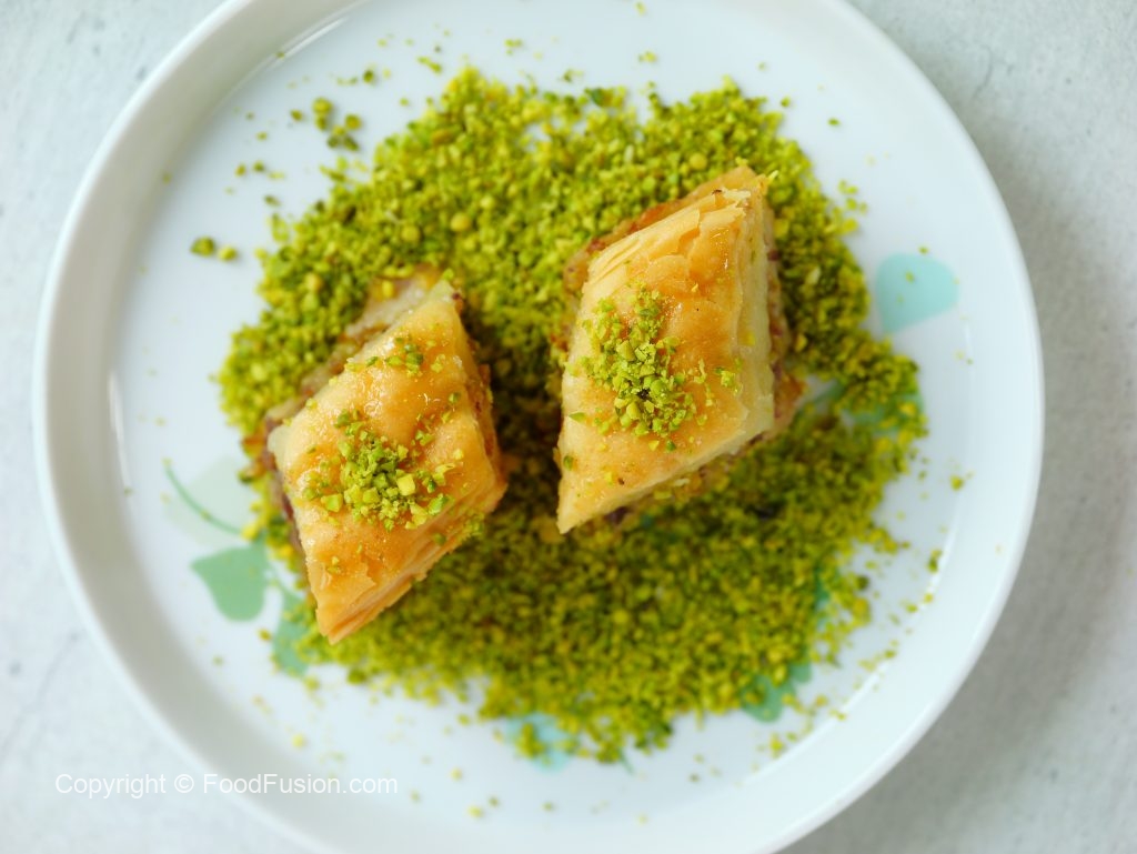 -Cut into diamond or square shapes of bakhlava using a sharp knife & separate the side of pan.