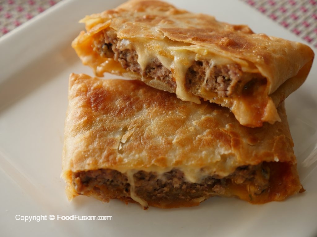 Place beef patty and fold all edges of flat bread (roti) and apply egg white to seal the edges.