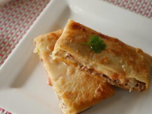 Beef patty rakh dein aur flat bread (roti) ka tamam edges ko fold ker lein aur egg white laga ker seal ker lein.