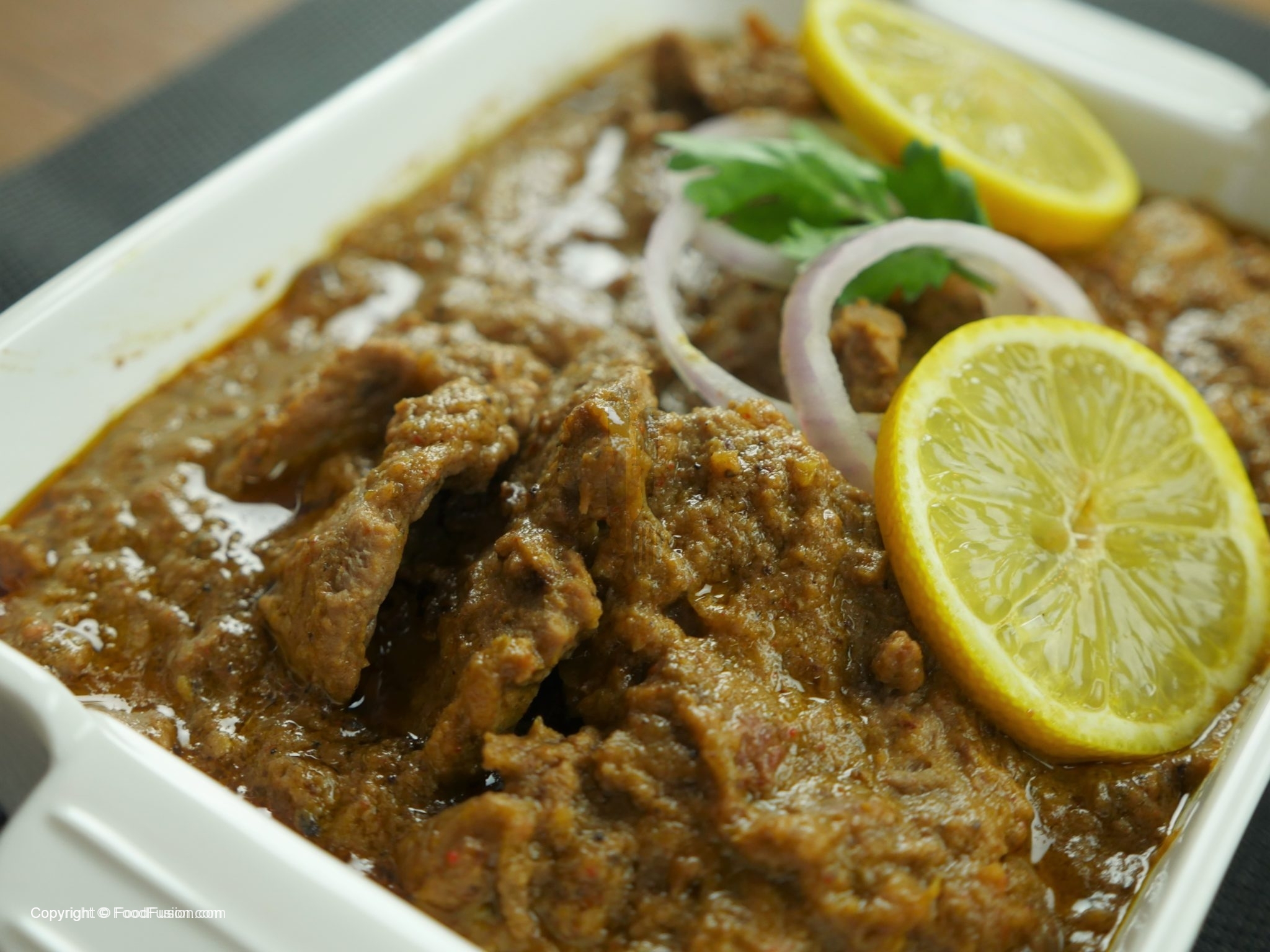 In a pan, heat oil and layer marinated beef fillets on top of each other and cover. On medium heat let it cook for 20-25 mins or until meat is tender and oil is separated.