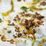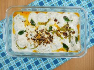 In serving dish,add fried baray (dumplings) and spiced yogurt.