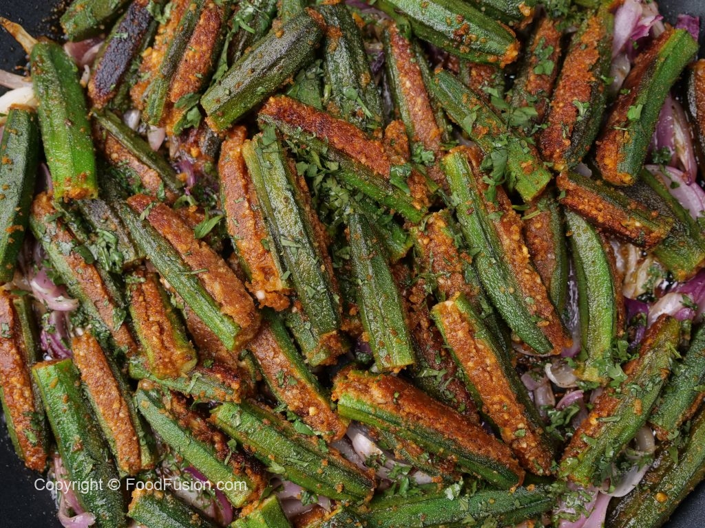 -Add stuffed okra,fresh coriander,cover & cook on low flame for 4-5 minutes & serve!
