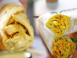 -Add prepared chicken filling (100g),place cheddar cheese slice,fold all sides & gently press to spread it.