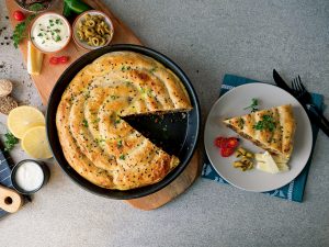 On 10” round baking dish with prepared egg & yogurt mixture (2 tbs),spread evenly & set aside.