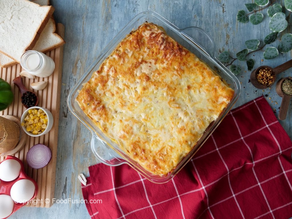 Baking dish mein tayyar white sauce dal ker pheela lein,bread slices rakh ker tayyar vegetable sauce,white sauce,cheddar cheese,mozzarella cheese,bread slices,red sauce,white sauce,cheddar cheese,mozzarella cheese,bread slices aur tayyar egg mixture dal ker upper sa cheddar cheese & mozzarella cheese dal dein