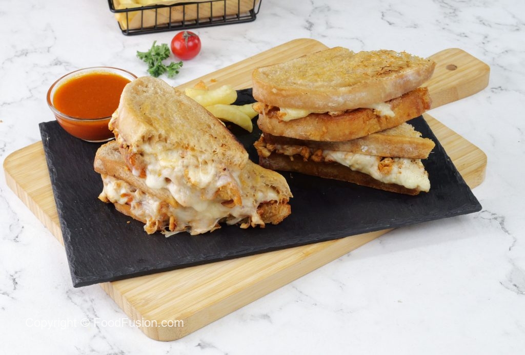 -On toasted sour bread slice,add melted chicken & cheese & top with another bread slice to make a sandwich (makes 4-5 sandwiches).