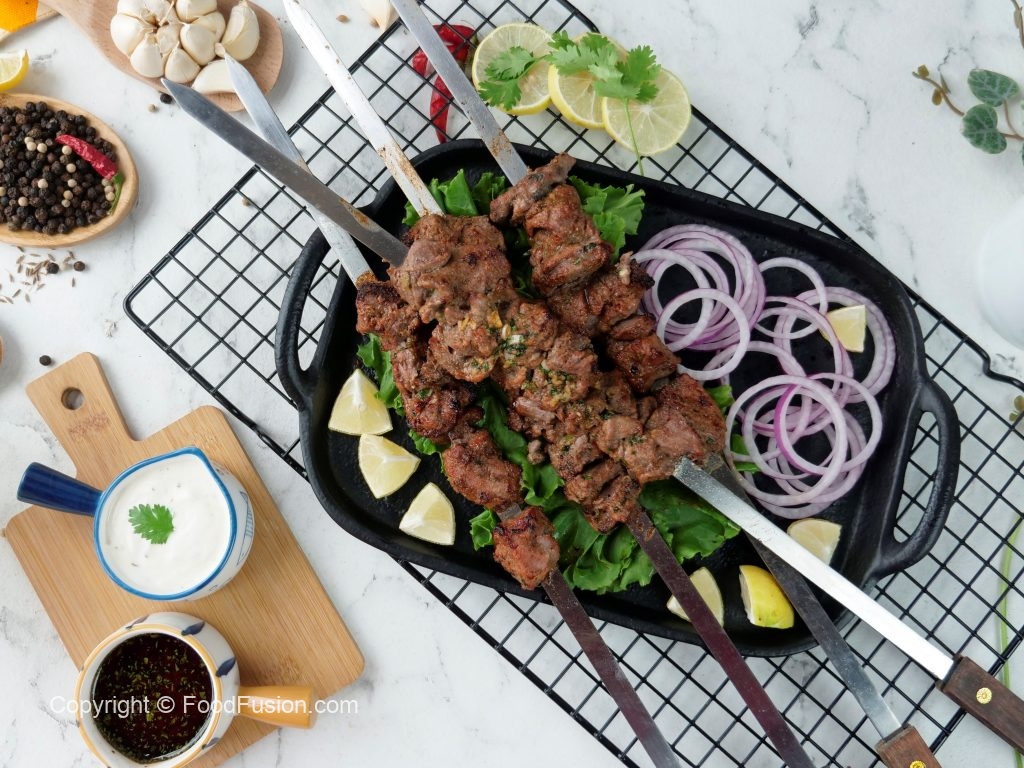 Marinated mutton ko metal skewers per laga lein aur jaltay hoye koyla per paka lein aur bech bech mein tayyar herbed makhan lagatay rahien.