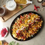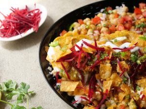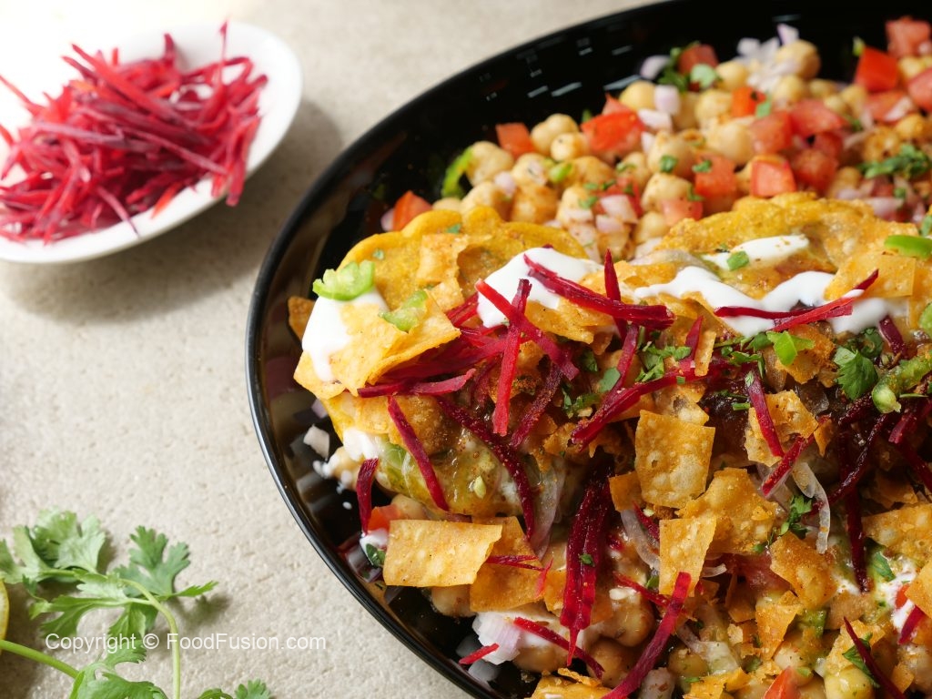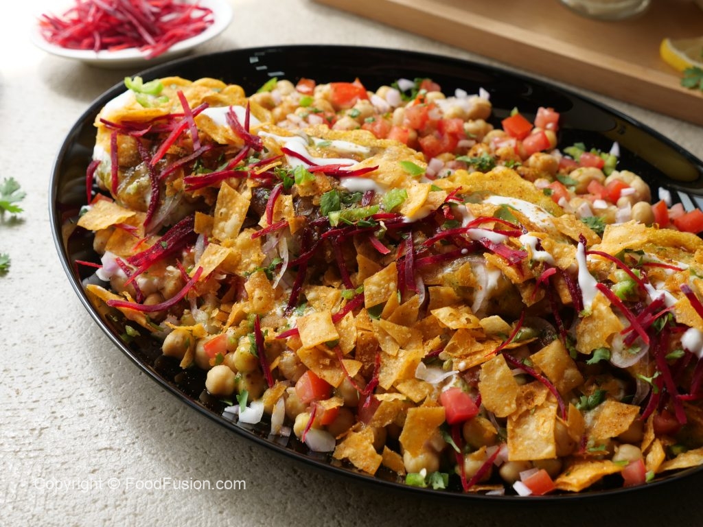 -In a serving platter,add chickpeas,tomato,onion,green chilli,chaat masala,fried potato chops, yogurt,green chutney,prepared imli ki khatti chutney,onion,prepared meethi khajoor chutney,papri, beetroot,green chilli,fresh coriander,chaat masala & serve!