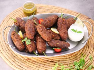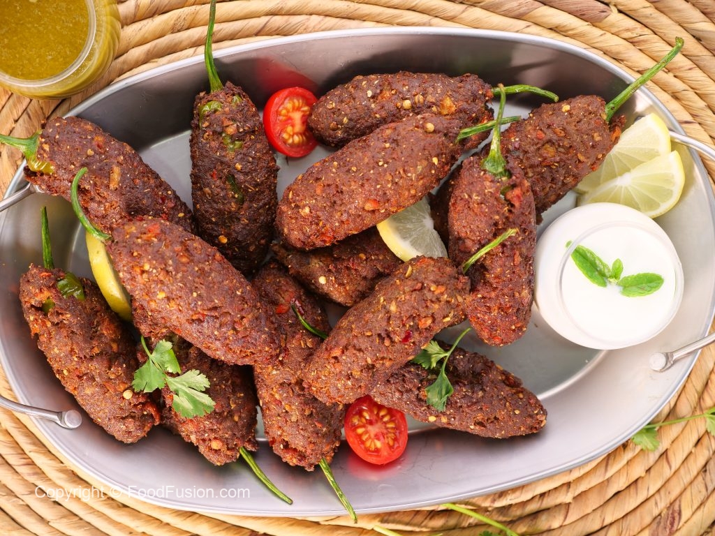 -Take small quantity of chapli kabab mixture & flatten it on your palm,place stuffed green chilli in the center & coat evenly.