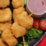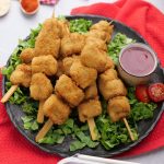 -Coat chicken skewers with all-purpose flour then dip in whisked eggs & coat with breadcrumbs.