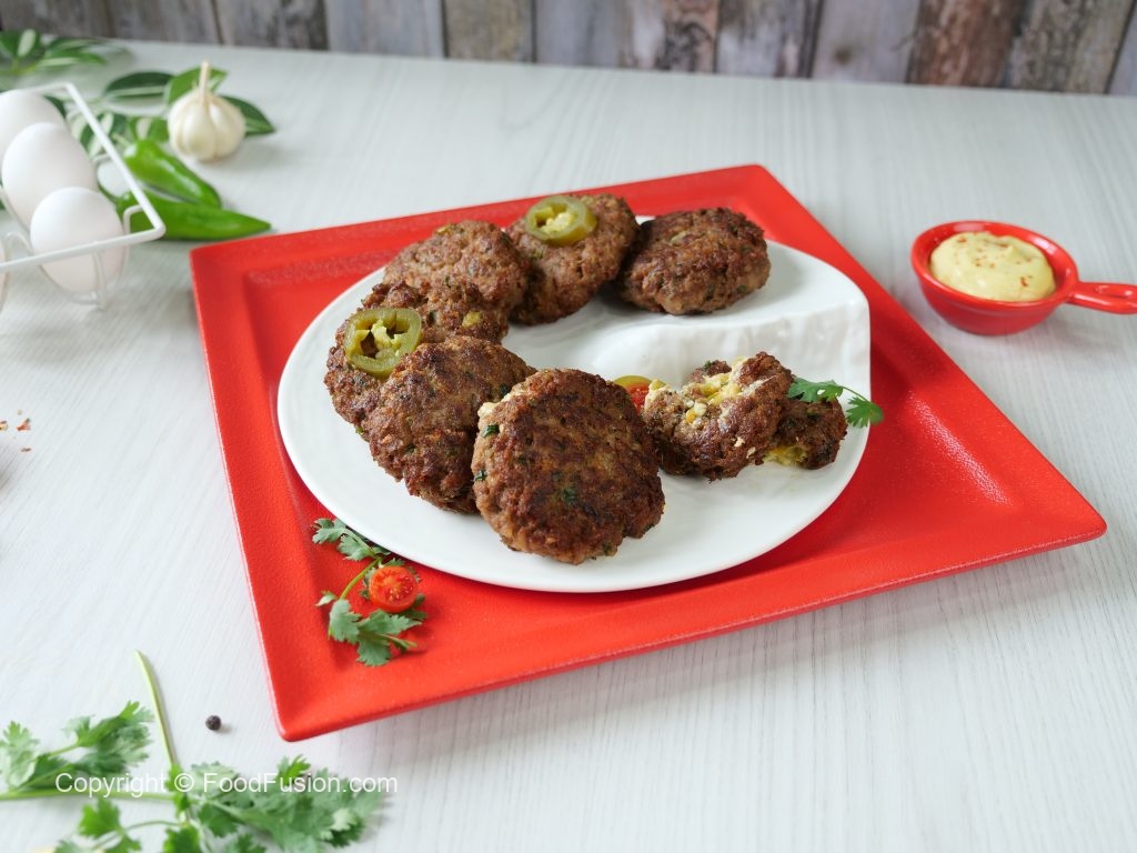 -Take small quantity of mixture (60g) & spread it on your palm,place cheese jalapeno patty & cover properly to make kabab of equal sizes.
