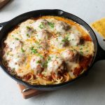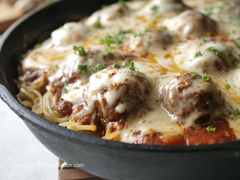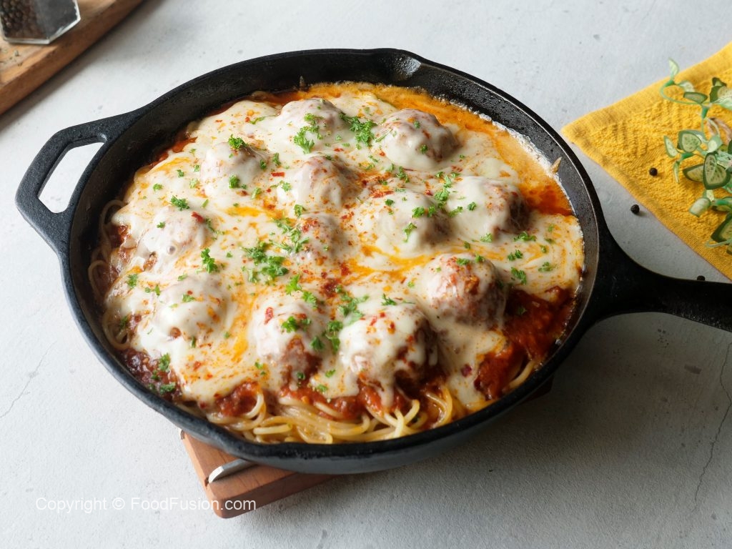 Tayyar meatballs ko sauce ka saath dal dein,cheddar cheese,mozzarella cheese aur lal mirch crushed dal dein aur dhak ker halki ancch per cheese melt ho janay tak paka lein (4-5 minutes).