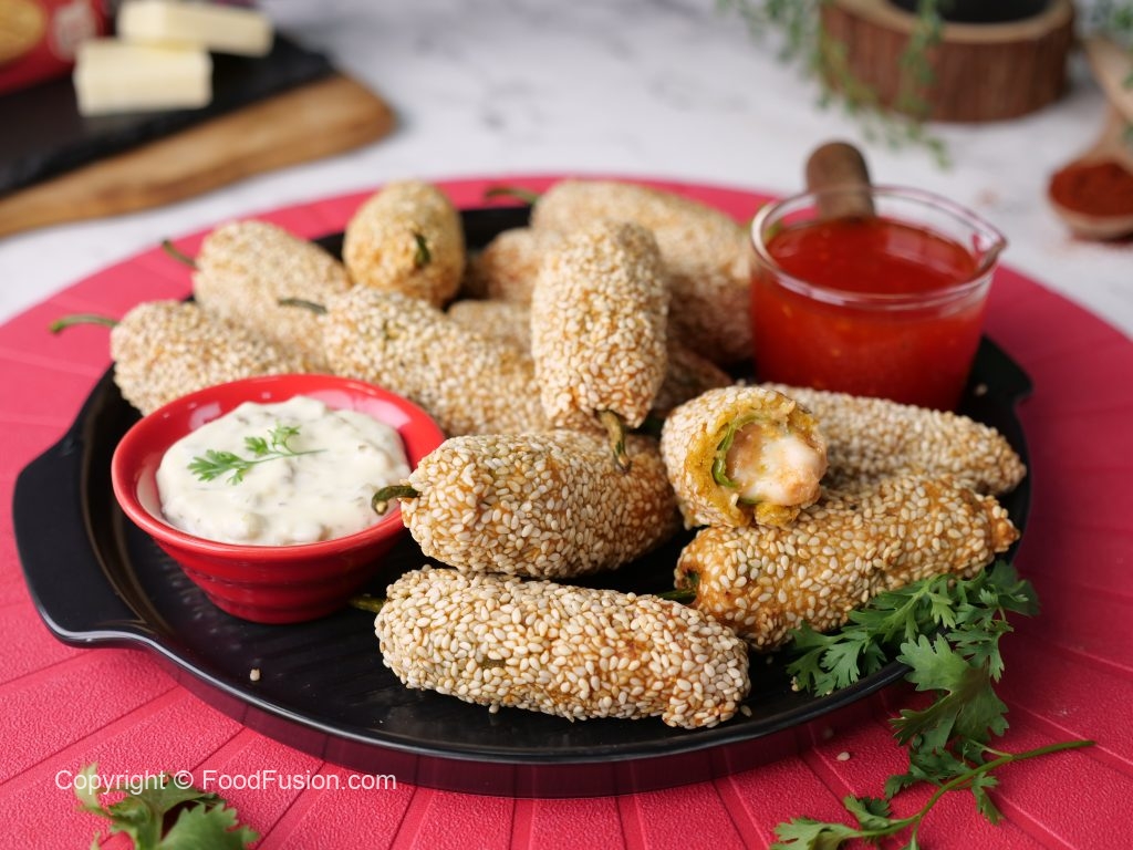 -Stuffed green chillies with prepared filling,coat in gram flour batter then coat with sesame seeds (makes 30-35) & let them rest for 15 minutes.