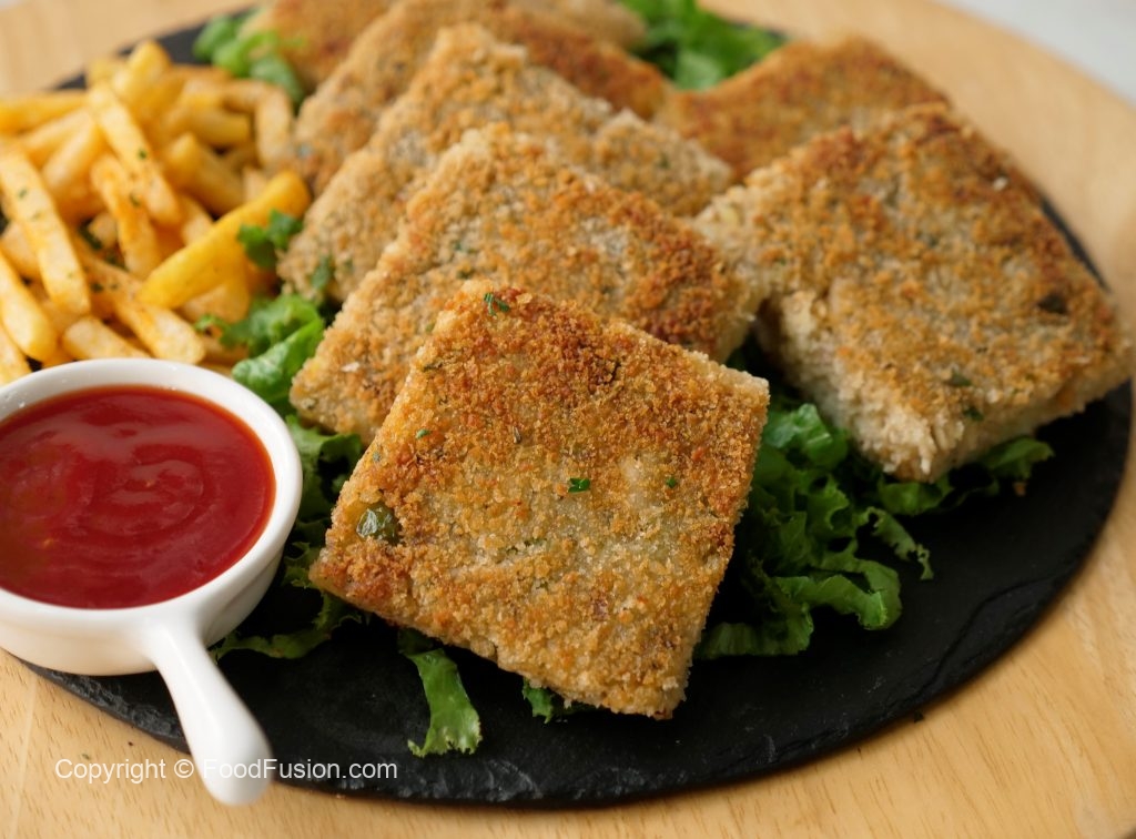 Four piece mein cut ker lein aur bread slice ki potato side ko breadcrumbs sa coat ker lein (makes 8 bread slices).