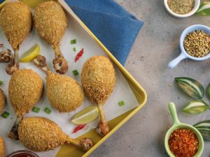 -Coat chicken drumsticks with all-purpose flour,dip in whisked eggs then coat with cornflakes.