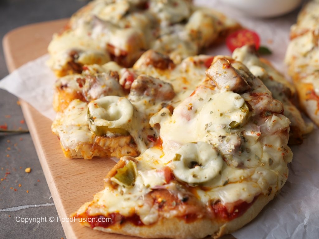 -Pizza sauce dal ker pheela lein,cooked chicken,pyaz,tamatar,pickled jalapenos,mozzarella cheese,cheddar cheese,dried oregano & lal mirch crushed dal dein (makes 6).