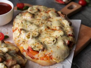 -Add & spread pizza sauce,add cooked chicken,onion,tomato,pickled jalapenos,mozzarella cheese,cheddar cheese,dried oregano & red chilli crushed (makes 6).