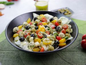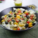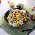 -In a bowl,add iceberg lettuce,prepared mini chicken kafta (approx. 30),black olives,green olives,cucumber,reddish, onion,yellow cherry tomatoes,red cherry tomatoes,fresh coriander,2-3 tbs of prepared gm salad dressing & give it a good mix.
