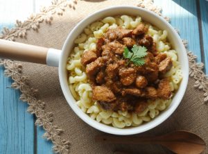 On serving plate,add boiled macaroni,korma masala & serve!