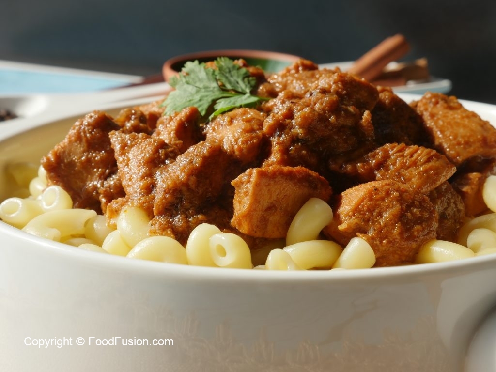 Serving dish mein boiled macaroni aur korma masala dal ker serve karein!