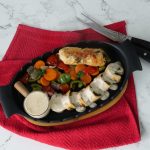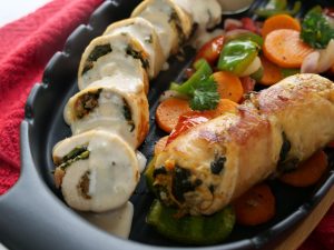 Drizzle cheese mushroom sauce on chicken roulades & serve with grilled vegetables & cheese sauce!