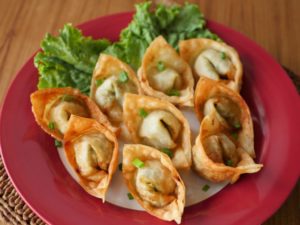 Apply egg on one side of triangle and overlap to form wonton shape (makes 25-30).