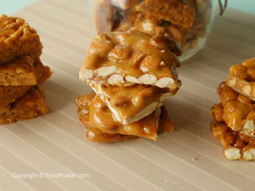 Grease working surface or tray with oil then transfer peanut mixture to the grease surface,shape to a rectangular and roll the mixture with the help of rolling pin evenly.