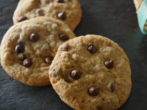 Grease baking tray with oil,take a mixture and make a ball,place it over the baking tray and slightly press it and add chocolate chips.