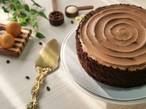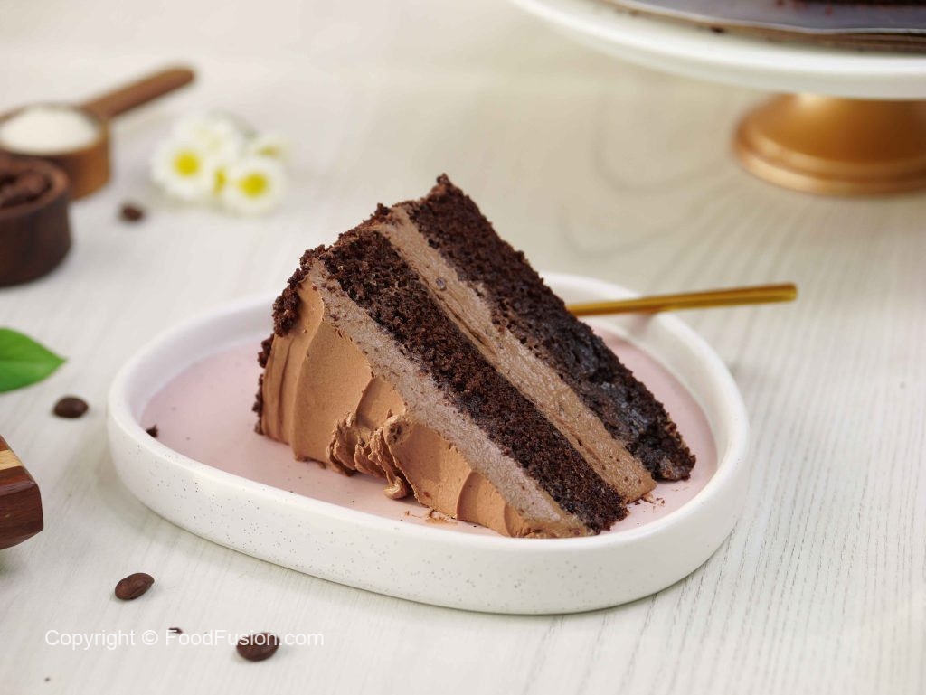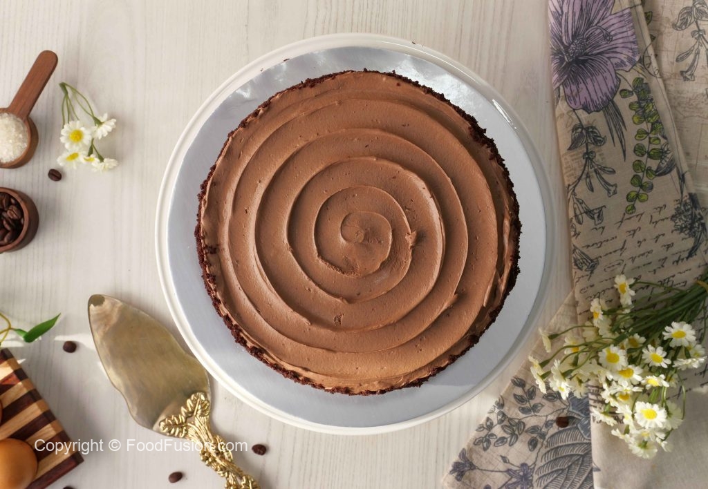 -Cake ki first layer ko cake stand per rakh dein aur sugar syrup drizzle ker ka tayyar frosting laga lein.