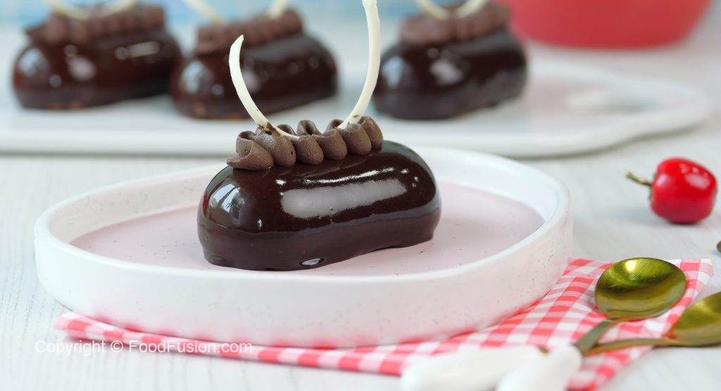 -Pipe out the chocolate mocha mousse in oval shape silicone cake mold,spread evenly & place a thin layer of sponge cake,press gently & freeze for 6 hours or overnight in freezer.
