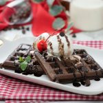 -Chocolate waffles per vanilla ice cream,tayyar chocolate sauce & chocolate chips dal dein,cherry & mint leaves sa garnish ker ka serve karein.