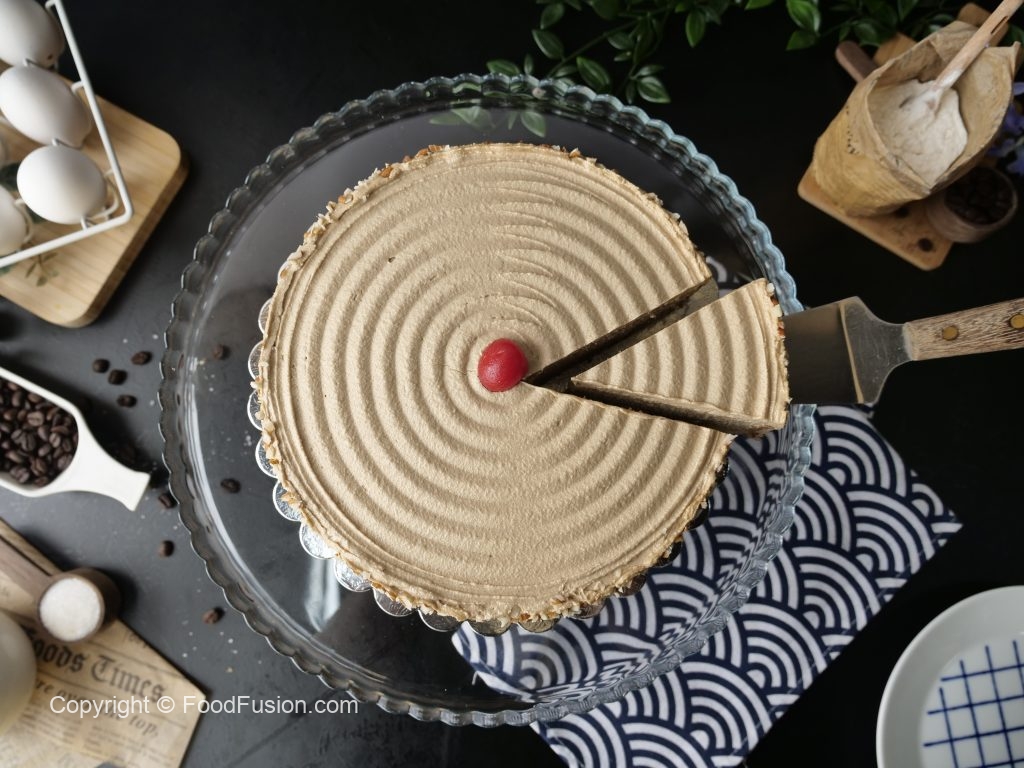 Cake stand per cake ki first layer rakh dein,coffee syrup aur coffee butter frosting dal ker pheela lein,badam dal dein aur cake ki top layer rakh dein.