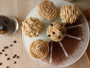 Put the cupcakes on a cooling rack to cool,when cooled,pipe the frosting over the cupcakes and decorate with coffee or chocolate chips.