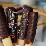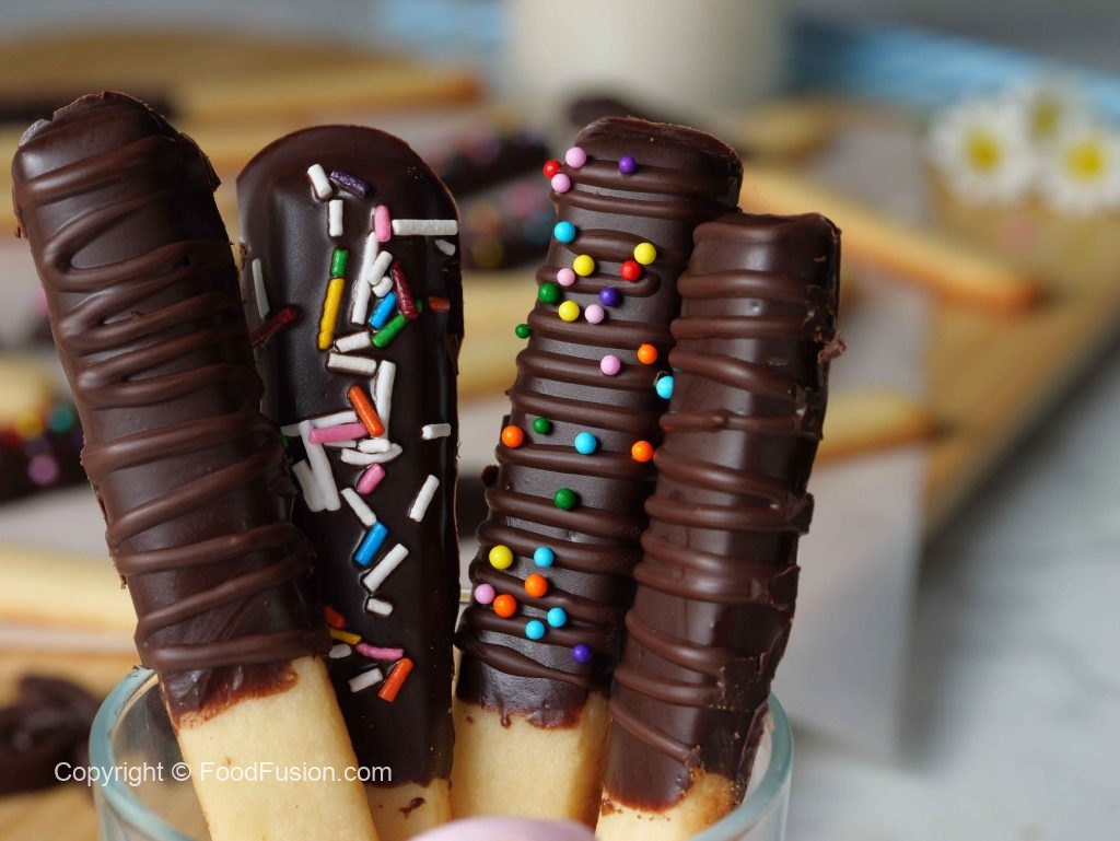 -Cookie sticks ko melted chocolate mein dip karein aur multi sprinkles se decorate karein.