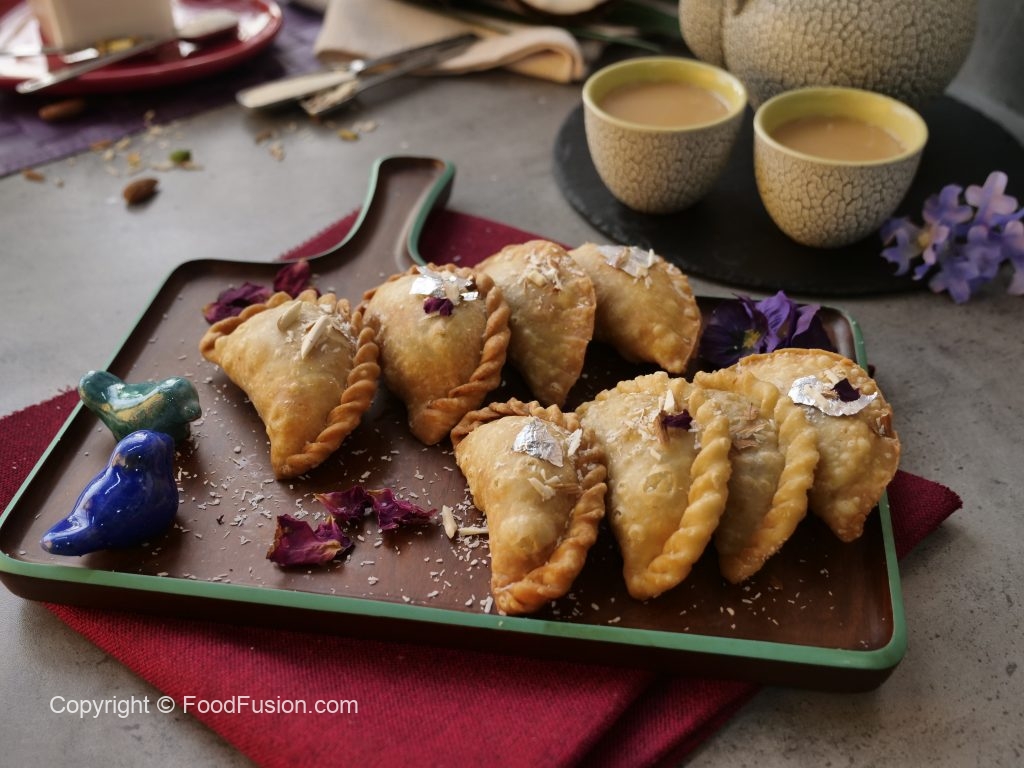 Round dough mein creamy coconut filling dal ker edges per pani laga lein, ek side ko flip ker lein aur fold ker ka samosa ki shape bana lein (makes 22-23).