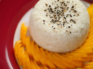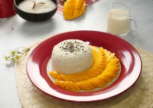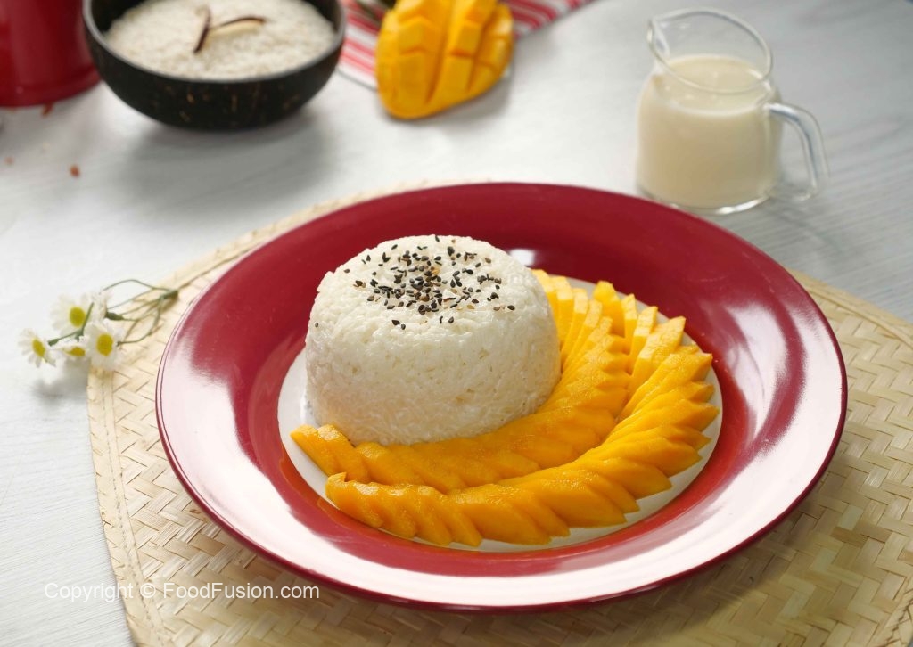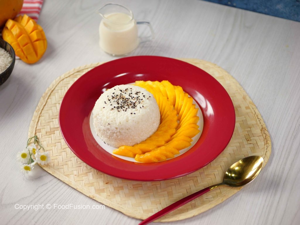 -Serving plate mein sticky rice,mango slices,kalay til aur creamy coconut sauce dal kar serve karein!