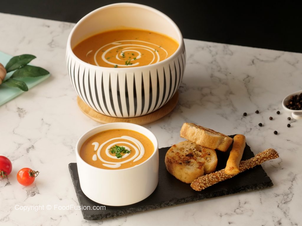 This quick, easy Creamy Tomato Soup is comfort in a bowl, especially when it is topped with the goodness of Olper’s Dairy Cream. #OlpersDairyCream #GoodnessBarhjaye #FoodFusion #DigitalAmmi #HappyCookingToYou