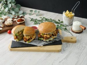 -On burger bun,add & spread mayonnaise,iceberg,crispy fried chicken,prepared spicy mayo sauce ,prepared cheese patty,spicy mayo sauce,iceberg & pickled jalapenos.