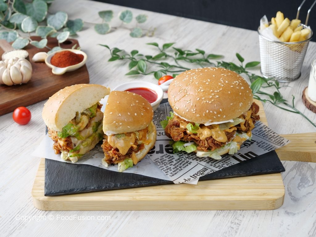 -Burger bun per mayonnaise laga lein,iceberg,crispy fried chicken,tayyar spicy mayo sauce,tayyar cheese patty,spicy mayo sauce,iceberg & pickled jalapenos dal dein.