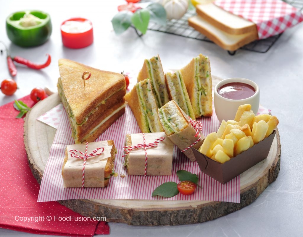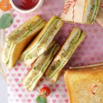 -Place cheddar cheese slices (cut into triangles) & spread prepared green chutney on another bread slice & flip it to make a sandwich.