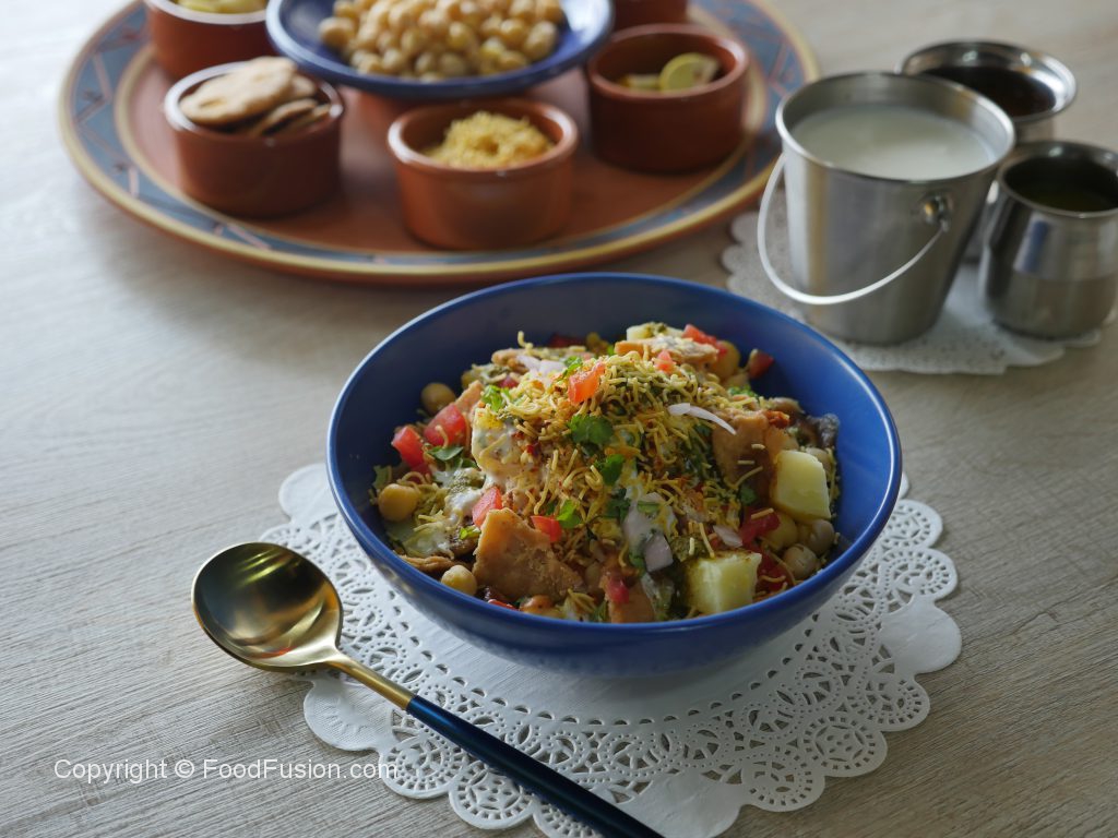 Serving plate mein papri,dumplings,chanay,aloo,tamatar,pyaz,namak,lal mirch crushed,chaat masala, zeera,lemon juice,hari chutney,khajure imli chutney,dahi,chanay,papri,aloo,tamatar,pyaz,sev nimco,dahi,hari chutney,khajure imli chutney,hari chutney,lal mirch crushed,namak,chaat masala aur hara dhania dal ker serve karein.