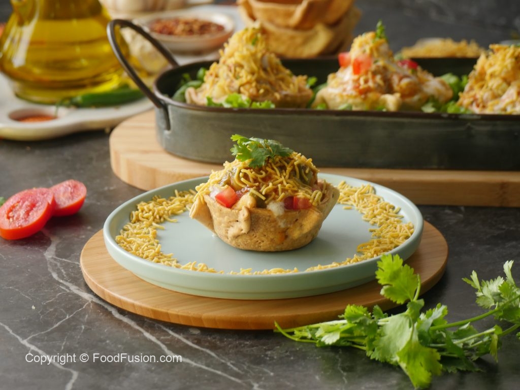 On dough pocket,add bhondi,chaat masala,potato,tomato,onion,spicy hari chutney,imli ki meethi chutney,prepared yogurt,chaat masala,red chilli powder,sev nimco & serve!
