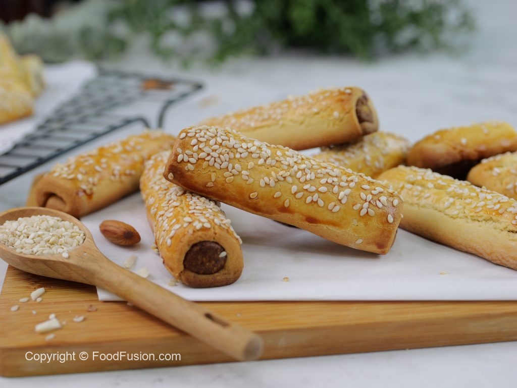 -Dough per rolled date filling rakh dein aur dough ko slightly roll ker lein aur edges ko seal ker ka 3” finger cookie mein cut ker lein.
