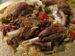 -In a pot,add cooked meat,carrots,capsicum,raisins,cashew nuts,walnuts,reserved ground spices 1 tbs,cooked rice & spread evenly.