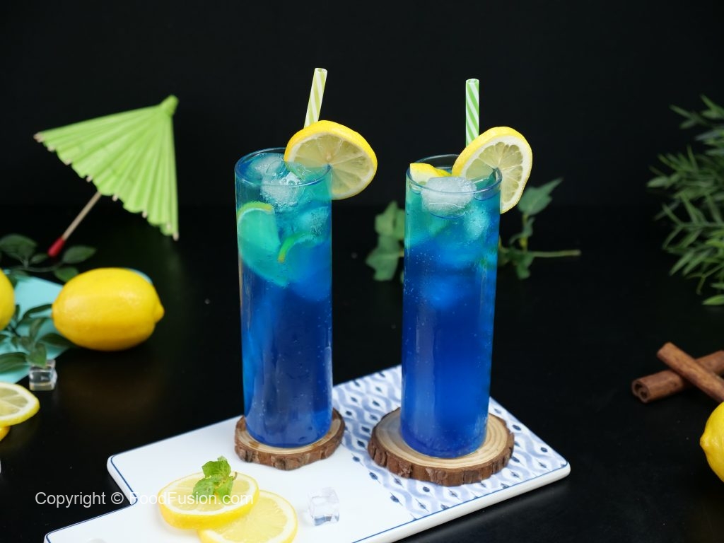 -In a serving glass,add ice cubes,lemon slices,7up,prepared blue curacao syrup (2 tbs) & stir well.